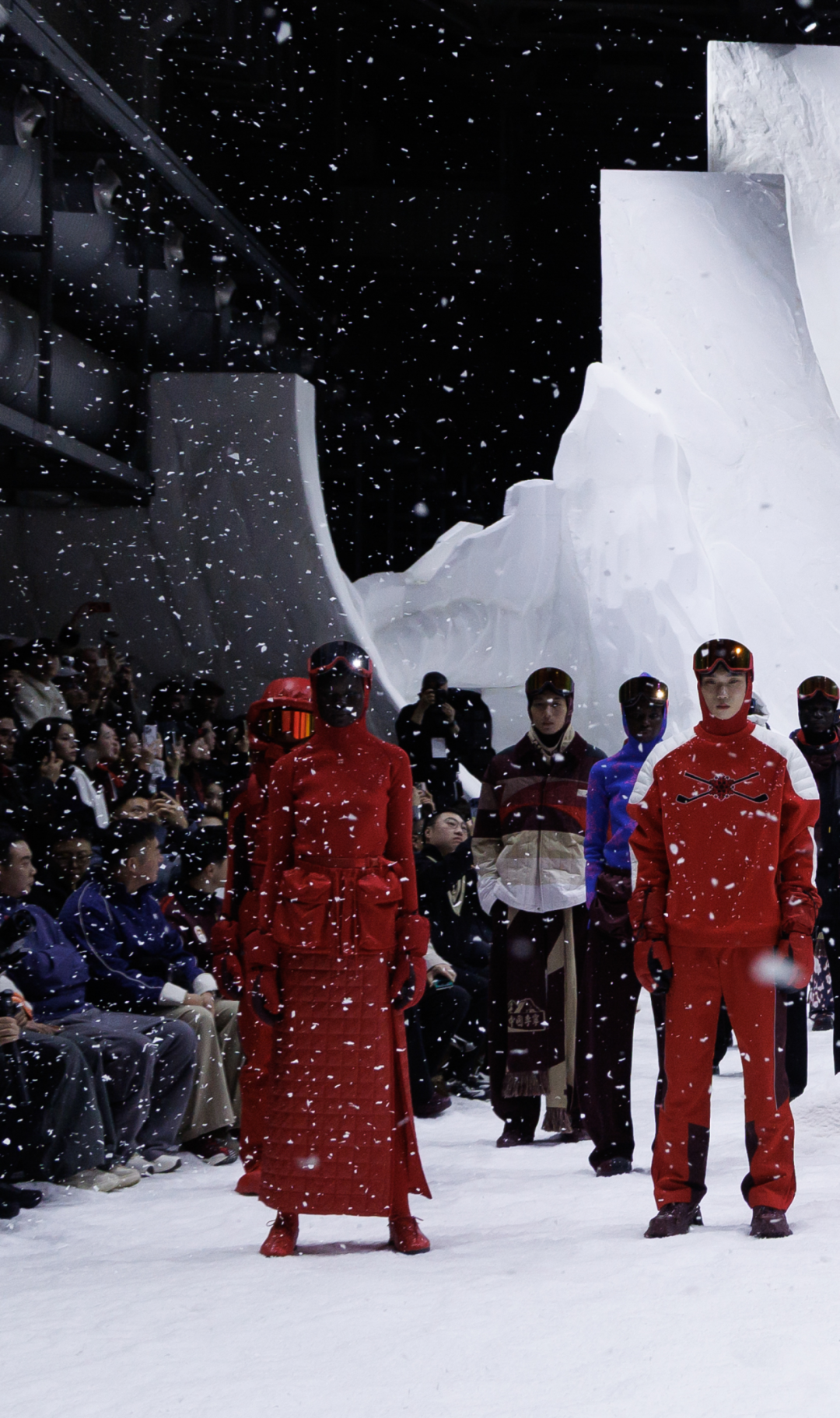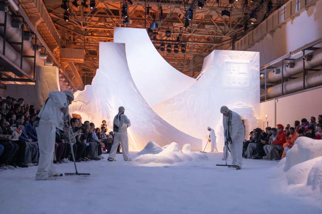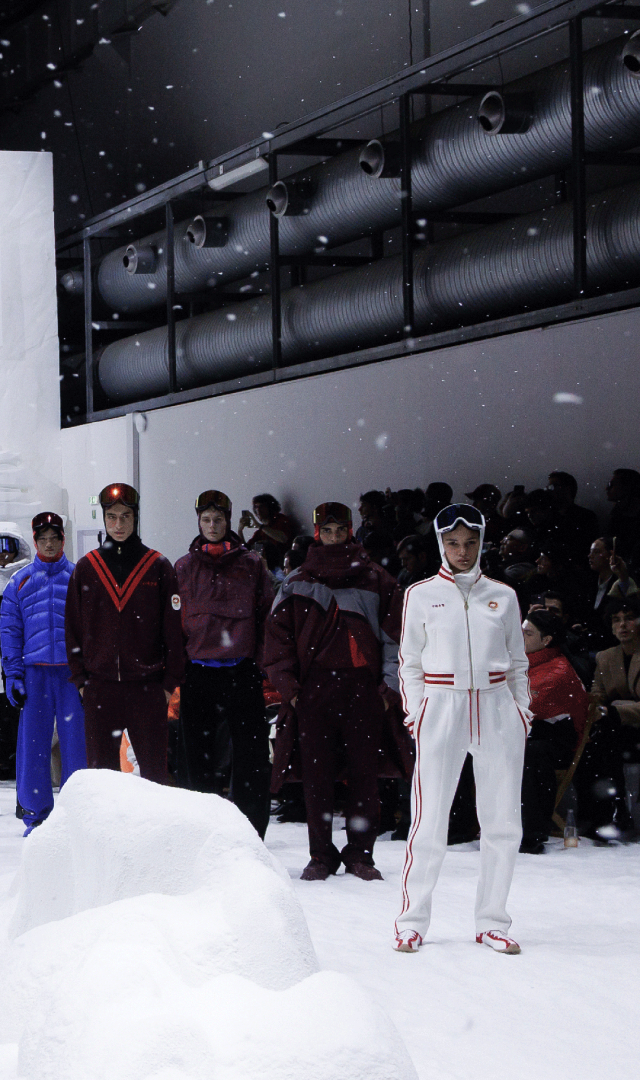 怀旧色调渐渐过渡至纯白雪景,来到主秀场,视野被辽阔的雪场景观无限放大,冬季运动竞技场跃现眼前。取自专业滑雪赛道与运动员舒展姿态的动态轨迹与空间张力,令秀场氛围更加真实而沉浸。