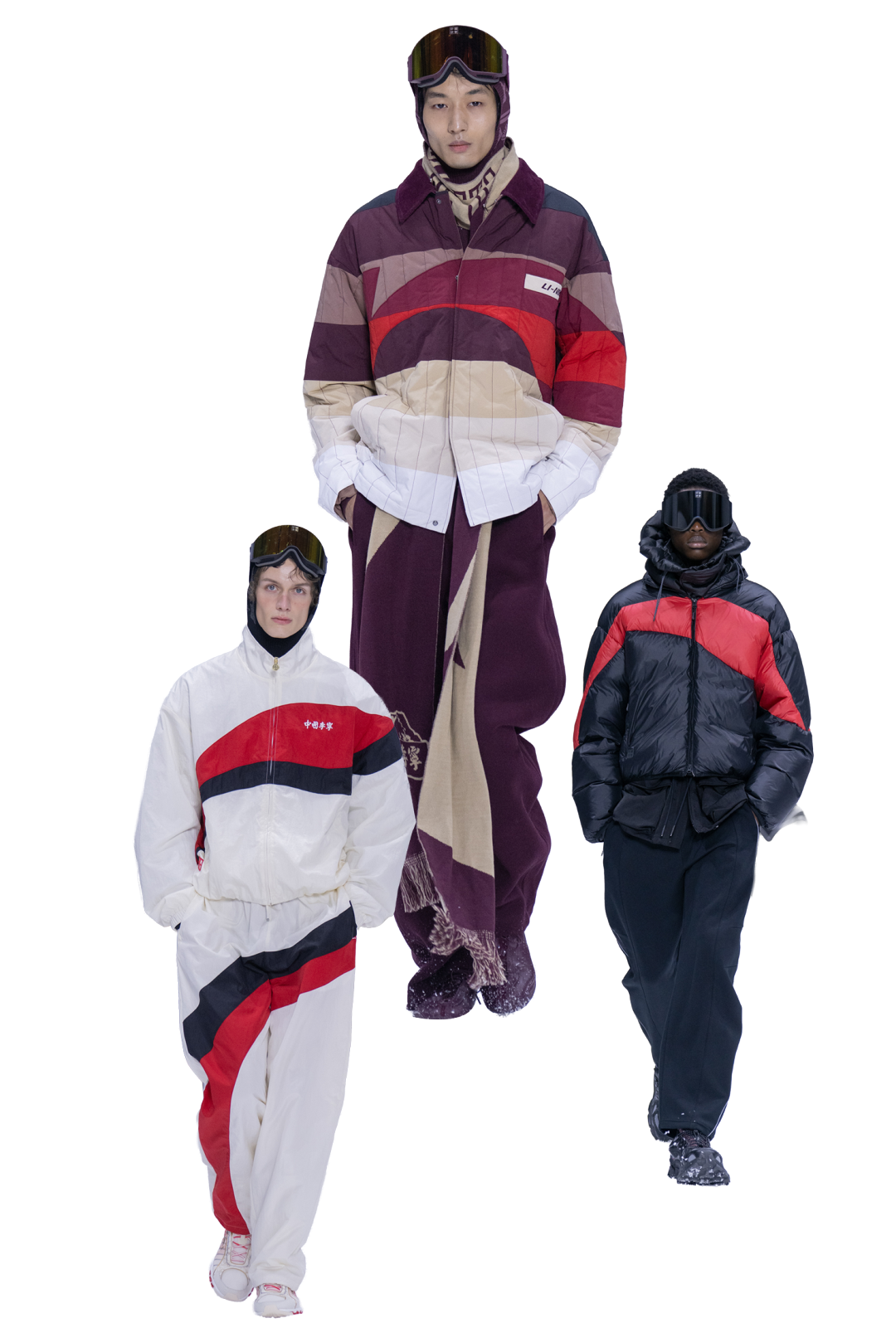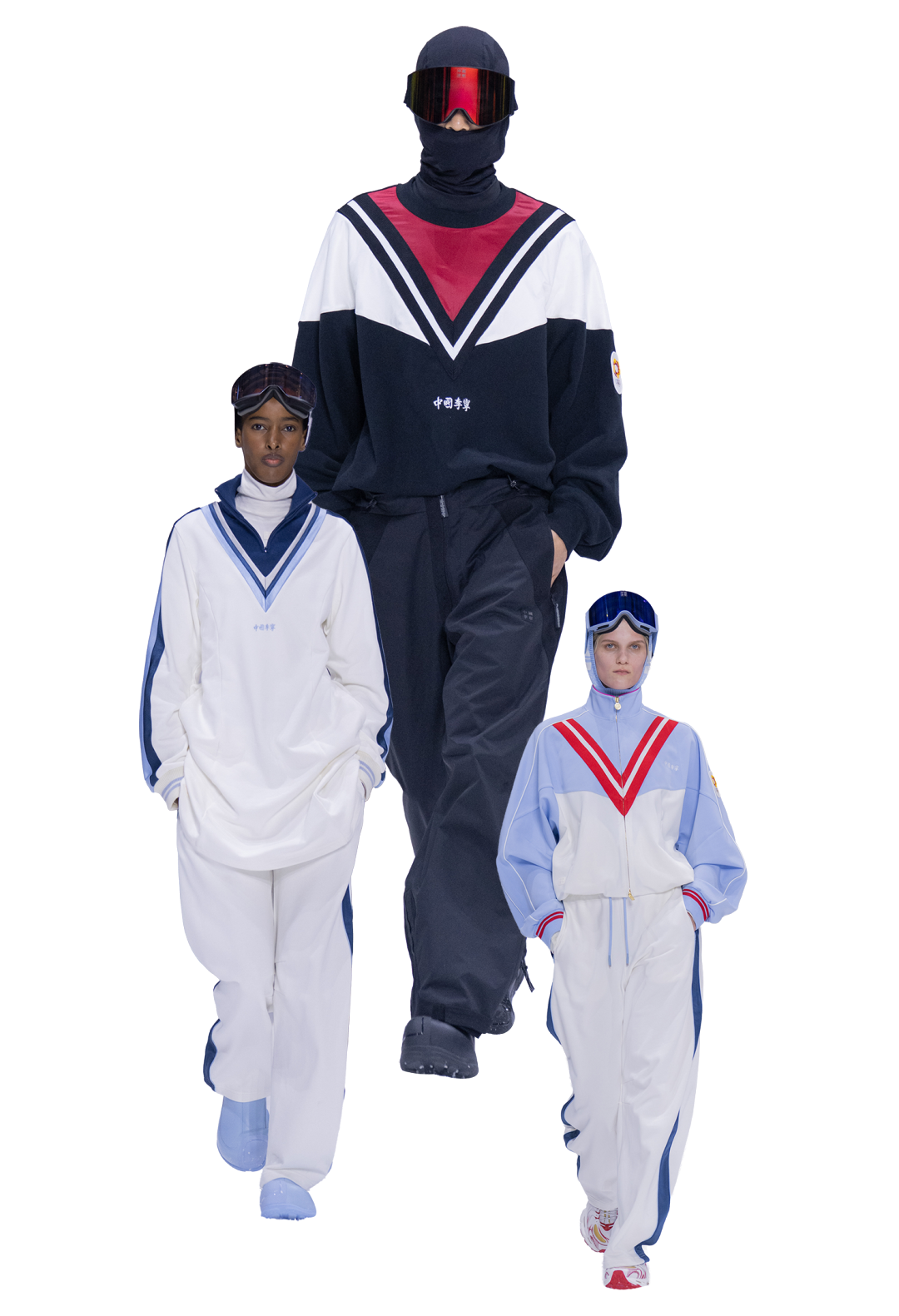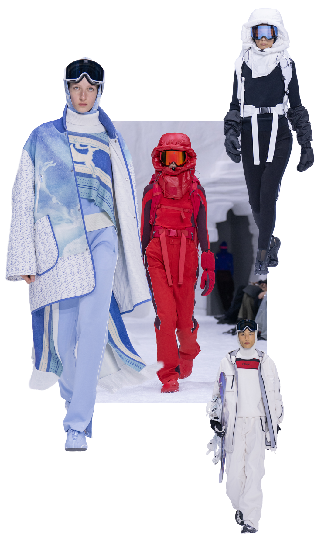 怀旧色调渐渐过渡至纯白雪景,来到主秀场,视野被辽阔的雪场景观无限放大,冬季运动竞技场跃现眼前。取自专业滑雪赛道与运动员舒展姿态的动态轨迹与空间张力,令秀场氛围更加真实而沉浸。