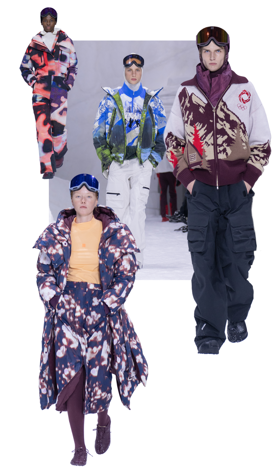 有趣的是,品牌还将灵感目光溯源至中国阿勒泰的滑雪运动起源,古老岩画描绘的滑雪图腾、阿尔泰山脉的雄浑线条、层层交织的冰川纹理与现代数字印花相结合,打造出跨越历史与未来的时尚风格。