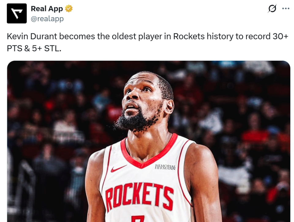全场杜兰特21中11,三分4中3,面对堪称灾难级别进攻环境,还是拿下31分3板1助5抢断,这让37岁130天的杜兰特成为火箭队史单场拿下至少30分5抢断最老的球员,无奈他依旧无法扭转局面。