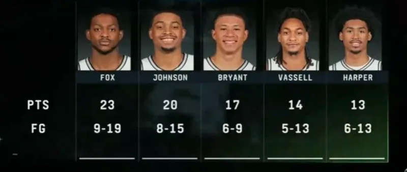根据数据统计,马刺今日6人得分上双,分别是福克斯25分、约翰逊20分、卡布17分、瓦塞尔14分、哈珀13分、科内特10分。